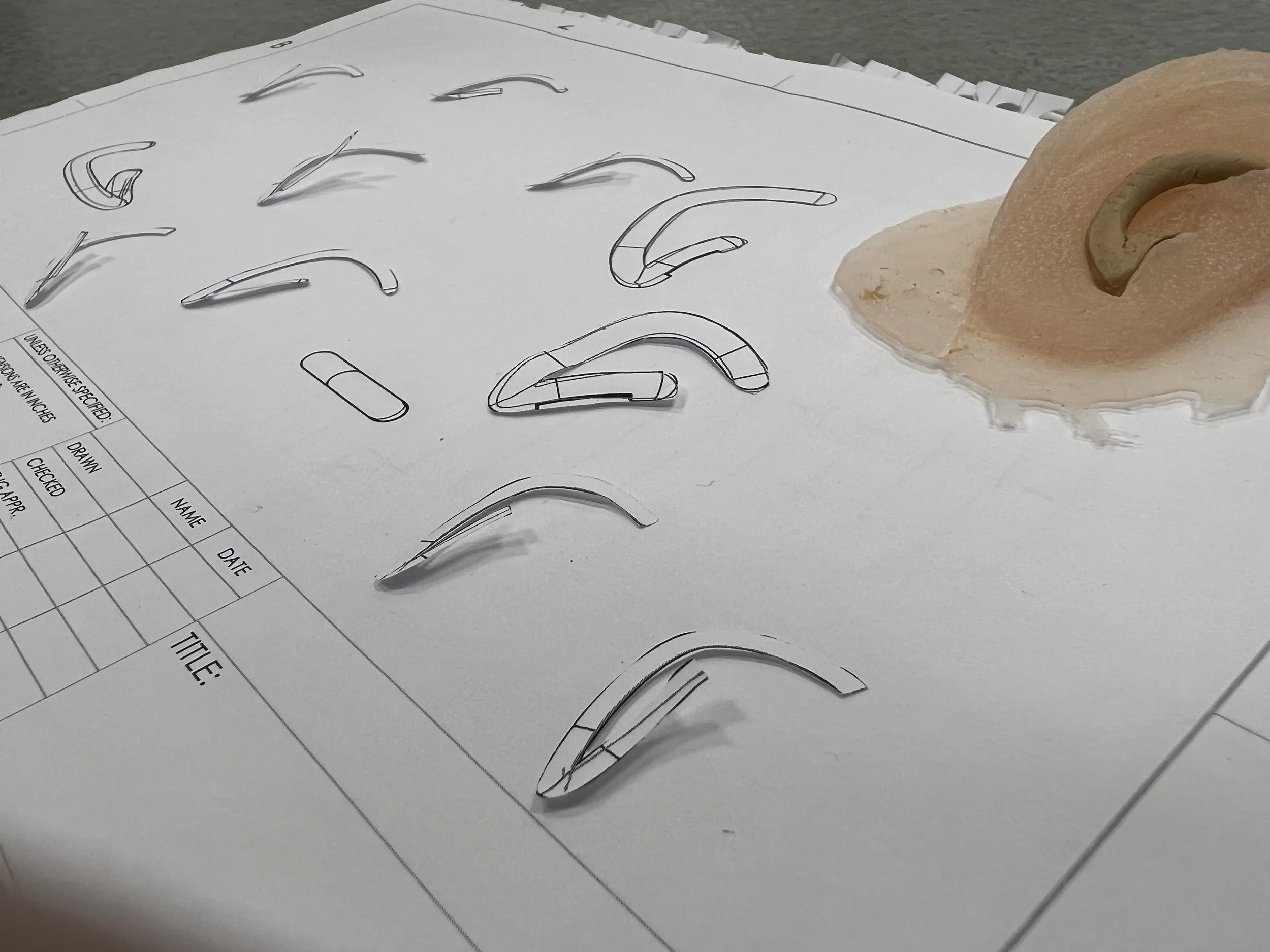 This process included researching my specific topic, making an earbud that is specific to fitting people who have ear canal stenosis, and sculpting my own ear. I was able to use my own ear for this project as I have a baby ear canal that is narrow similar to ear canal stenosis. After sculpting a clay ear, I made the three-part mold, enabling me to make silicone versions of my ear that were the base/guide so I could sculpt versions of my appliance to fit the ear.